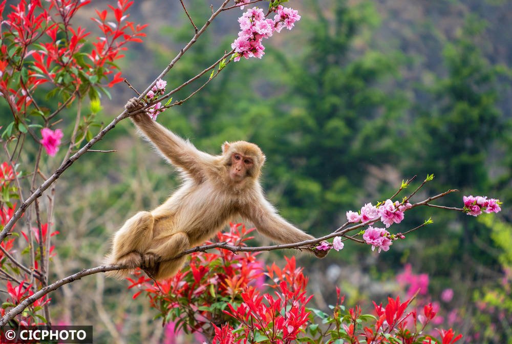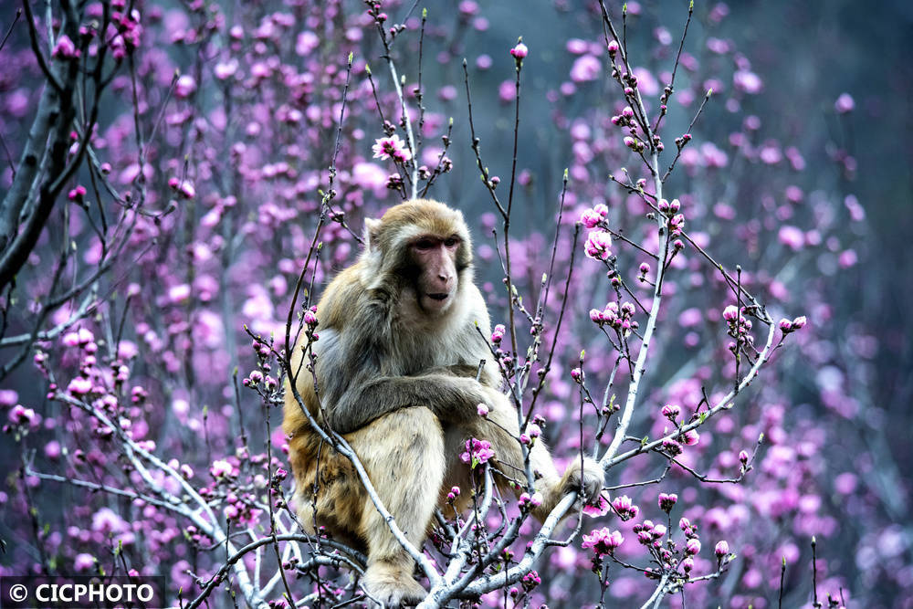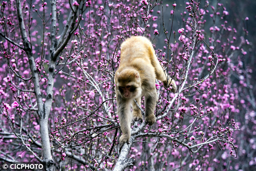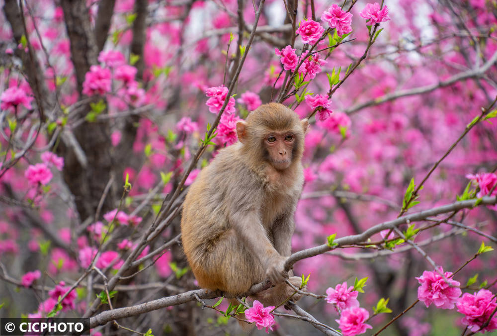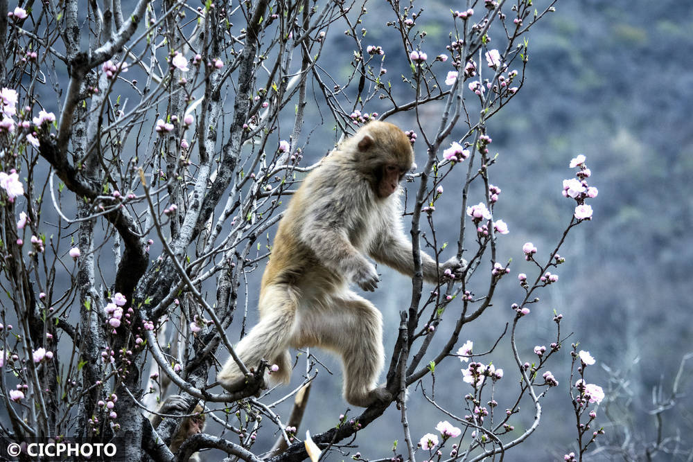 河南省济源市五龙口风景区地处河南太行山猕猴国家级自然保护区内。春暖花开的时节,太行猕猴在花丛间嬉戏、觅食,享受美好春光。
